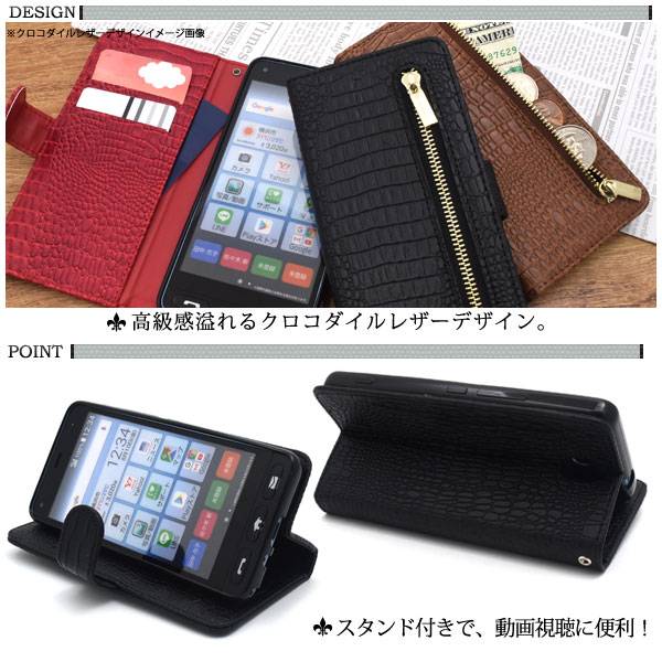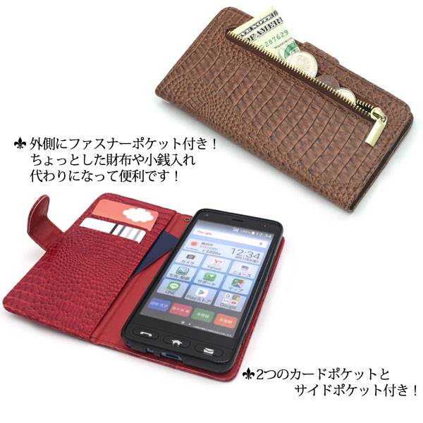 ファスナーポケット、カードポケット2つ、サイドポケット付き! かんたんスマホ 705KC用クロコダイルレザーデザイン手帳型ケース クロコダイルレザーデザインの手帳型ケース。