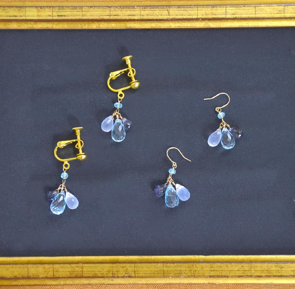 サイズ:約20x12mm 素材:K10・ブルートパーズ・カルセドニー・アパタイト・アイオライト 金具:イヤリング(ネジバネ式・シルバー925・ゴールド仕上げ・ピアス・K10・フック式 日本製