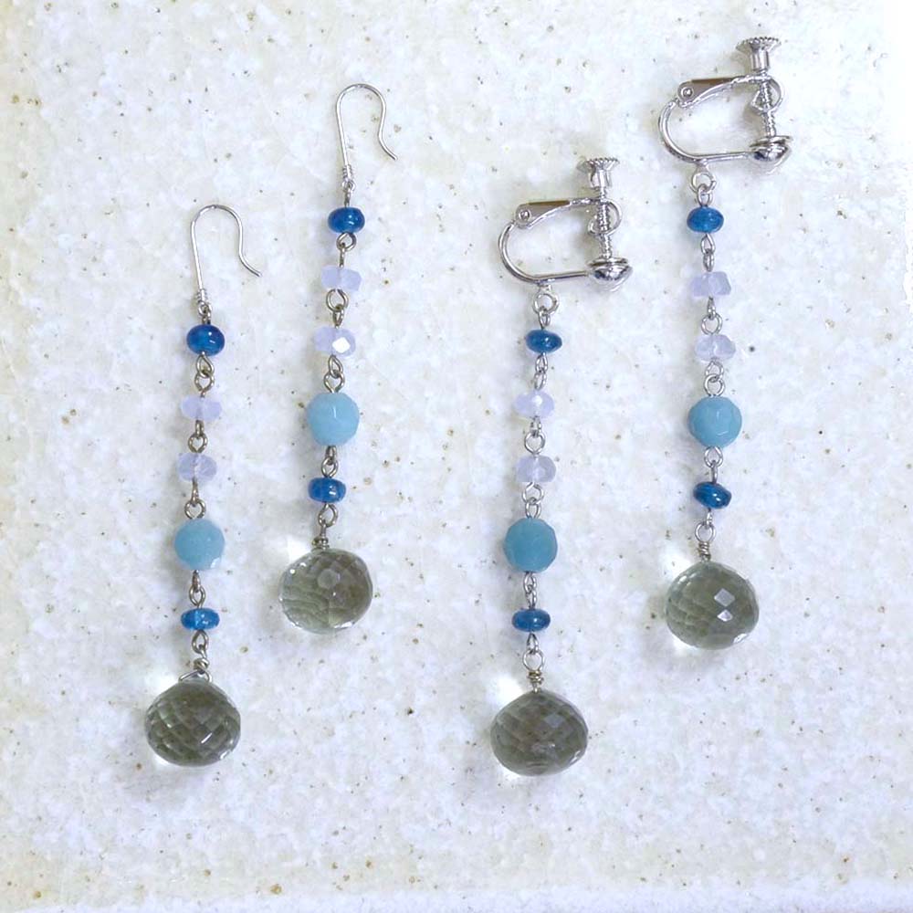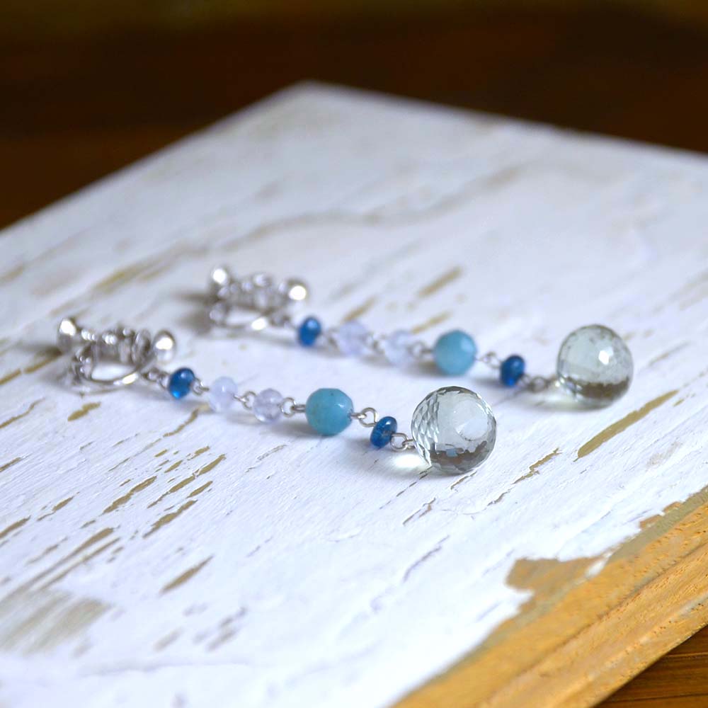 アパタイトやアマゾナイト、ブルーカルセドニーのブルーのグラデーションが美しく、先についた透明感のある大粒のグリーンクォーツが揺れてキラキラ輝きます。
